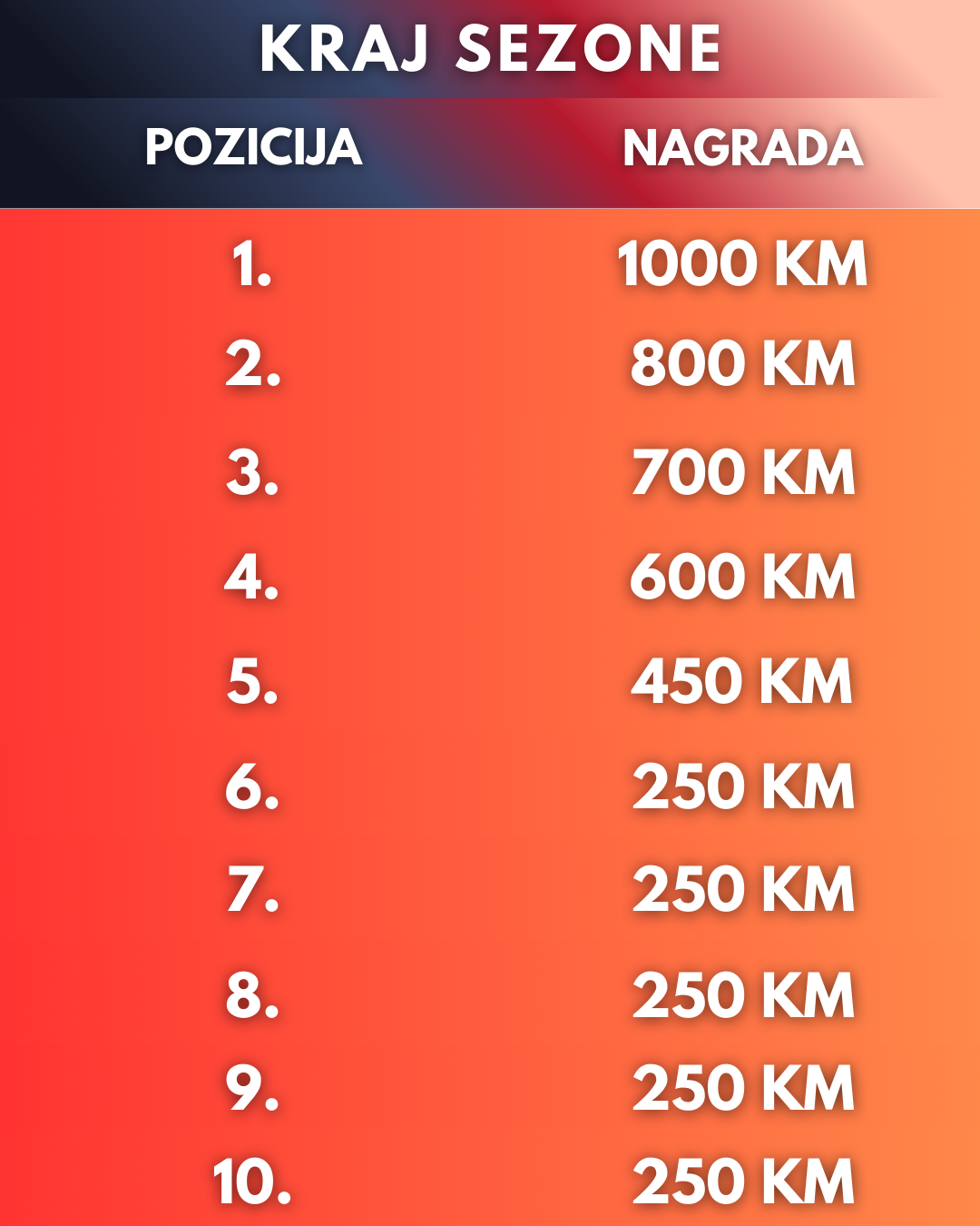 - Nagrada na kraju svakog kola dodjeljuje se u bonus sredstvima a na kraju ukupne sezone u freebet sredstvima.Bonus i freebet sredstva aktivna su na nalogu 96 sati.